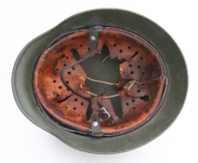 Item: H332 Exterior displays light to moderate wear with approx 93% of the factory feldgrau (field gray) paint remaining. Authentic and period factory applied Heer adler survived in better condition and rates approx 97%. Tight fitting liner system 100% original to the helmet. All three untouched split pin rivet fasteners intact and complete with all three slotted washers. Goat skin leather liner fully pliable, undamaged and has taken on a darkened aged appearance. Drawstring in place. Buckle end of chinstrap is steel. Long portion fully pliable and in its entire length. R.B. Nr code on tip. Quality control ink stamp visible on interior crown of helmet. Overall excellent condition.