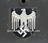 Item H436: Exterior displays very minimal wear with only storage abrasions evident. Approx 98% of the factory paint remaining. Authentic and factory applied Heer adler decal commensurate with the overall wear and also rates approx 98%. Super tight liner system 100% original to the helmet. All three untouched split pin rivet fasteners intact and complete with all three slotted washers. Sheep skin leather liner fully pliable, undamaged and still exhibits a slightly creamy appearance. Drawstring in full length with original knot in place and also features sealant still on both of the tips. Buckle end of chinstrap is steel with approx 95% of the gray paint remaining. Long portion of strap is in full length and pliable. Overall excellent condition.