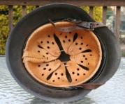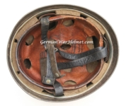 Item H440: This helmet is from my personal collection. Only selling because I recently purchased a 1948 Harley-Davidson. It was indirectly Veteran sourced by myself out of Medford, Oregon back in March of 2009. Unfortunately there is no provenance. It is also published in Paul Martin’s book titled “The Camouflage Helmets of the Wehrmacht“. Exterior displays a tri-color pattern mixed with woodchips. Colors are green, tan and dark red mixed with woodchips and or sawdust to give it that rough texture. A very strong 98% of the camo remains. Super tight fitting liner system 100% original to the helmet. All three untouched split pin rivet fasteners intact and complete with all three slotted washers. Goat skin leather liner fully pliable, undamaged and has taken on a darkened aged appearance. Drawstring in full length with original knot still in place. There are two buckles ends of the chinstrap on each bale. That’s exactly how the helmet was acquired. The buckles themselves are aluminum. Long portion of strap fully pliable. Partial name in white paint of the German soldier on the rear of flange and also initials on the left side. This is a very high grade helmet and only two others are known to exist in collections with the same color, pattern and texture.