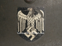Item H397: Exterior displays very light wear with approx 97% of the factory feldgrau (field gray) paint remaining. Authentic and factory applied Heer adler decal commensurate with the overall wear and rates 97% excellent condition. Super tight fitting liner system 100% original to the helmet. All three untouched split pin rivet fasteners intact and complete with all three slotted washers. Sheep skin leather liner fully pliable, undamaged and still has a creamy appearance. Drawstring in full length with original knot in place. Buckle end of chinstrap is steel with approx 95% of the gray paint remaining. Long portion of strap is in full length and pliable. Manufacturer and date on tip is indiscernible. Crisp and clear quality control ink stamp visible on interior crown of helmet. Overall excellent condition.