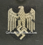 Item: H348 Exterior displays approx 97% of its original feldgrau (field gray) factory paint. Only storage abrasions and transfer marks evident. Authentic and factory applied Heer adler decal in just slightly better condition and rates approx 98%. This is a correct “Bigfoot” decal for the Quist manufacturer. Super tight fitting liner system 100% original to the helmet. All three untouched split pin rivet fasteners intact and complete with all three slotted washers. Goat skin leather liner fully pliable, undamaged and has taken on a darkened aged appearance. Drawstring in full length with original knot still in place. The ends of the drawstring still have the sealant on the tips. Buckle end of chinstrap is steel with approx 97% of the gray paint intact. Long portion of the chinstrap has been by an inch or two to accommodate the soldier who wore it. It is fully pliable with a minor (half way) split that has been repaired. Overall excellent condition!