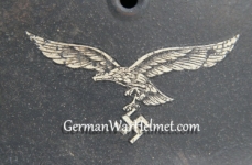 Item: H319 Here is a very large size 68 helmet. These do not become available too often and are hard to find in such a large size. Exterior is in near perfect condition. Factory blaugrau (blue gray) paint rates approx 99%. The authentic and factory applied Luftwaffe adler decal is in superior condition and rates a solid 99%. Tight fitting liner system original to the helmet. All three untouched split pin rivet fasteners intact and complete with all three slotted washers. Sheep skin leather liner fully pliable, undamaged and still retaining a rich creamy color appearance. Drawstring is in place. Buckle end of chinstrap is aluminum. Long portion of strap is in full length and pliable. Manufacturer and date stamp visible on tip. Overall excellent high quality condition.