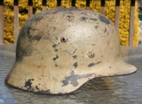 Item: H212 Here is an authentic period ex whitewash camo helmet. Most of what collectors call ex whitewash helmets are mistaken and improperly described. If there is a small white build up around the rivets or in low areas it is really just oxidation from the aluminum oxide mixed in the paint. What is offered here is a true ex whitewash. On the under side of the helmet a white paint can be clearly seen in the corner of the factory fold over as well. Authentic and factory applied Heer adler decal is approx 80%. Liner system 100% original to the helmet. All three untouched split pin rivet fasteners intact and complete with all three slotted washers. Goat skin leather liner fully pliable, undamaged and has taken on a darkened aged appearance. Drawstring in full length with original knot still in place. Buckle end of chinstrap is aluminum. Long portion of strap is in full length and pliable. Manufacturer and 1940 date visible on tip. Overall excellent condition.