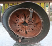 It was brought back after WWII by my uncle, Colonel William Thomas Watson. He served in France and Germany in the infantry. While I don’t know a great deal about his military history, he did fight at the Battle of the Bulge. During the battle, the radio with his group (I don’t know enough military jargon to know the technical name of the group a colonel would command) went out. Due to the lack of radio, they did not get the order to retreat. Because of this, at one point his unit was some number of mile behind the German Lines. After the war he brought this, along with a German gas mask, a canteen, a few swords and pistols, and some other stuff to my father, who was his younger brother, as souvenirs. My father, Charles Vernon Watson, was also a colonel, but he was with the marines in the pacific, 1st and then a founder of the 4th division. in the artillery. When I was a kid my friends always wondered why my father WWII sword had a Swastika on it. I don’t know the particulars of how he acquired the helmet, but it would have been during the actual war as he came home when the war ended and war not one of those who stayed around a long time after the war. For most of the time since then it was in my parents and my home. (Around 1957, after the movie The Vikings came out with Kirk Douglas, it briefly became a Viking helmet as I invaded England every afternoon after school, although it was really to heavy for me to wear well).